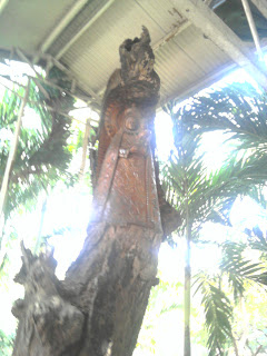 The wood carving at the base tells the story of Our Lady of Manaoag